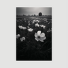 Dit werk toont een open veld met bloeiende bloemen in zwart-wit. De voorgrond is scherp, de achtergrond vervaagt langzaam. De horizon ligt laag. Het licht is zacht en diffuus. De bloemen lijken kwetsbaar, maar vullen het beeld volledig.