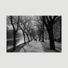 Dit dibond schilderij toont een winterse stadslaan langs het water. Kale bomen vormen een ritmisch patroon en werpen lange schaduwen over het pad. In de verte lopen mensen rustig door het landschap, terwijl de stad zich stil op de achtergrond houdt. Het zwart wit versterkt de diepte en de structuur van het beeld.