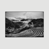Dit landschap laat lagen en diepte zien. De terrassen lopen in vloeiende bogen door de bergen terwijl mist tussen de toppen hangt. Het zwart wit versterkt het contrast tussen structuur en wolken.